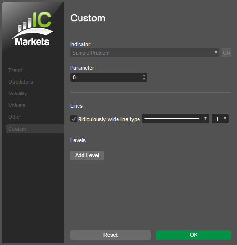 Hi, the line type in indicators window is extremely wide and when the output has a longer name, then it might hide other elements (color in the sample below). Please, make the line type smaller or the window resizeable.